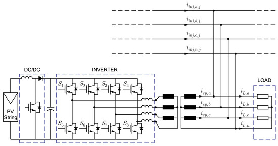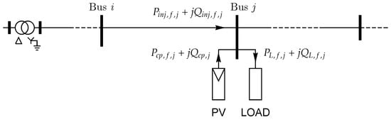Figure 2 shows a generic bus j of the radial LV network under study. It can be observed the active and reactive power flows in each phase f (a, b ,c) that will be used hereinafter, along with its reference directions: the injected power at the bus (), the power demanded by the load and the power supplied by the PV . The proposed algorithm will define for each PV inverter the active and reactive power set points for each phase ( and , in order to balance the network and to improve the voltage profile. These set-point values will be used to produce the aforementioned reference currents for the VSI.