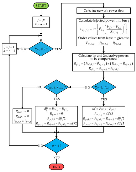 Next, this value is compared to the three-phase production at bus j, i.e., it is verified if . If so, the difference between these two power values is calculated. Then, the compensation powers for each phase at the bus j are obtained in the following way: