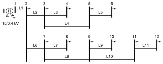 For the analysis of the impact of decentralized photovoltaic systems, a network with 12 buses connected to a 15/0.4 kV transformer is used, which is represented in Figure 5. In total there are 240 consumers, 105 single-phase and 135 three-phase, associated in 12 groups. Line impedances (resistance R and reactance X) are given in Table 1.