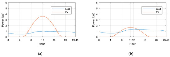 Through the PVGIS simulator [35], data on solar radiation were obtained. For this it was necessary to indicate the location of the network, the PV panels slope and their azimuth. For the present case, it was considered that all consumers had panels with 30° slope and 0° azimuth and that they were located in Lamego, Portugal, coordinates 41°05′00″N 7°52′00″O. The PV modules used are the same for all consumers and have a performance ratio of 19.7% and an area of 11.72 m2 for each group of modules that make 1 kW. The number of panels was established so that the annual energy produced had a value close to but less than the value of the annual energy consumption. Figure 6 presents, for one of the prosumers, the load profile and the PV generation profile for every hour, in the days with highest and lowest radiation along a year.