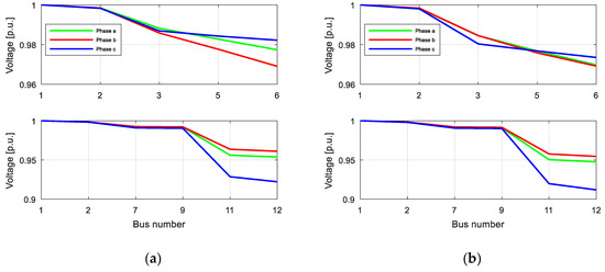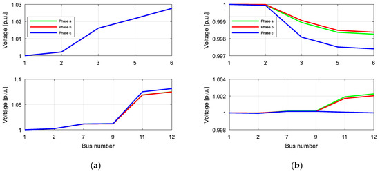 With respect to scenario 1 (Figure 9), it is possible to observe in Figure 11 that voltage imbalance is reduced on both days and that phase voltages are nearly equal. It is also possible to verify a reduction of the over-voltages, namely, from 0.11 p.u to 0.07 p.u., in the phase c of bus 12, for the day with the highest radiation.