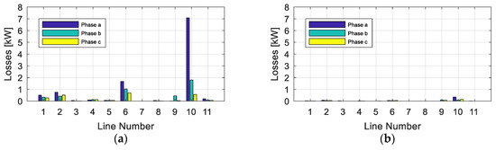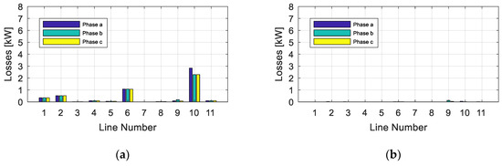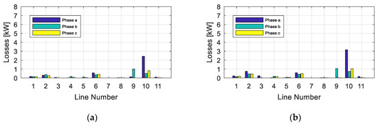 Analyzing Figure 12 and comparing it with the results obtained for the previous scenario (Figure 10), it can be seen that, in general, the phase balance led to a reduction in losses, although there have been small increases in certain phases. This is due to the increase in power injection in those phases in order to compensate for the imbalance.