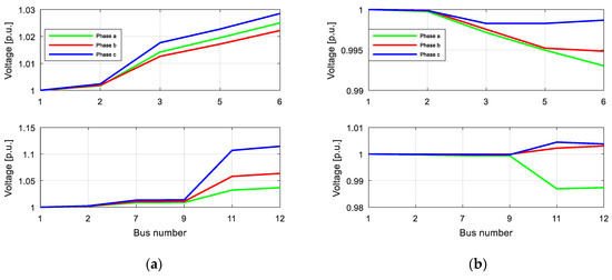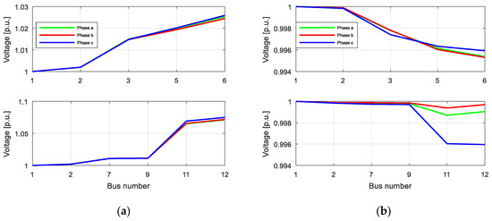 As can be seen in Figure 9a, since production is greater than consumption, voltages generally increase at the buses that are furthest from the MV/LV transformation. It is also possible to verify that the power injection does not improve the phase balance. The day of highest radiation is the worst case, with an overvoltage exceeding 0.1 p.u in bus 12 in phase c. On the other hand, on the day of the lowest radiation, the voltage levels improve, approaching 1 p.u. This happens because the power generated almost equals the power consumption (see Figure 6b as an example of a prosumer).