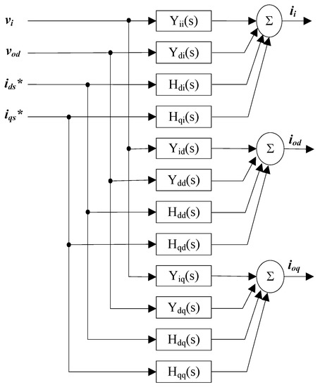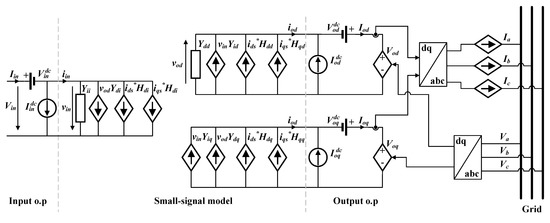 As described before, the AC signals can be considered as DC signals by using the dq framework. Consequently, each AC signal is split into its contribution to the d and q axes. In this work, only balanced systems will be considered, hence the zero sequence is neglected. The converter considered will be controlled as a current source [25], therefore, the input variables will be the input and output voltages, and and , respectively, where the last two variables are the decomposition of the three-phase output voltage in its d and q components. Besides, due to the connection to the grid, the frequency of the grid voltage can be considered as an input signal in case the effect of the variation of this variable in the response of the system must be considered. Furthermore, taking advantage of the superposition property, also the control references, such as references of active and reactive power, can be considered as inputs of the model. This fact is very appealing to EPCs working in microgrids as it allows taking into account the dynamic effect of variable references in the output variables of the converter, which is a common phenomenon in this kind of applications. In this case, the active and reactive current references are represented as inputs, and , respectively. Finally, the controlled and independent variables are set as outputs of the model, namely the input current and the dq components of the output current, and and , respectively. Please note that the same approach can be applied to any other type of converter with any control strategy mutatis mutandis.
