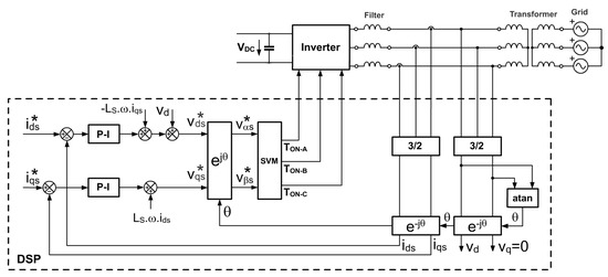The control system programmed in the control core of the Concerto microcontroller is the standard vector control for a converter connected to the grid, Figure 5. Two current loops control the d and q components of the current injected into the grid by means of fast proportional integral (PI) regulators. After adding the corresponding decoupling terms to the PI outputs, the voltage to be generated by the EPC is obtained, expressed in the moving dq reference frame.