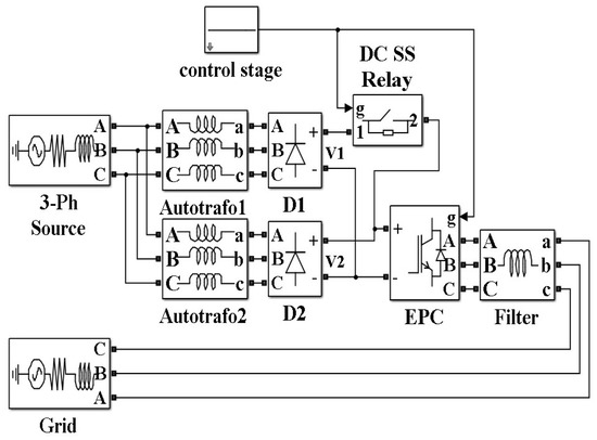 The main system comprises a standard electronic power converter made up of six IGBTs and anti-parallel diodes, plus a rectifier to charge the DC link capacitor, a three-phase step-up transformer and filter inductors, Figure 4.