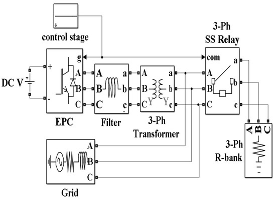 A resistor bank has been used in order to generate a step in the d component of the output voltage. These resistors are connected through a three-phase AC relay, which is managed by the microcontroller and synchronized with the oscilloscopes as in the previous case. The connection of the resistor bank is included between the grid and the three-phase transformer, so, afterward, the unterminated model can be extracted following the methodology detailed in [33]. The connection scheme implemented for this test is depicted in Figure 7.