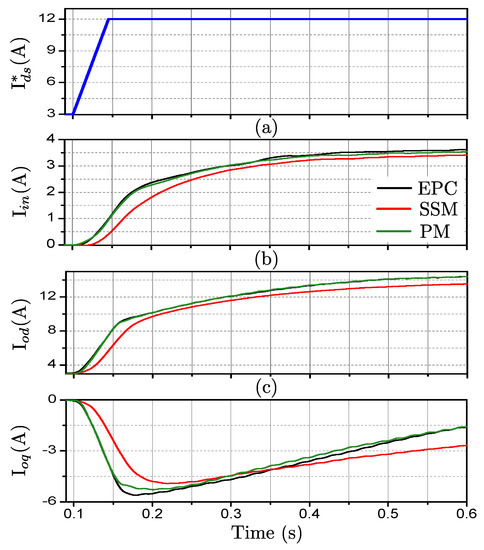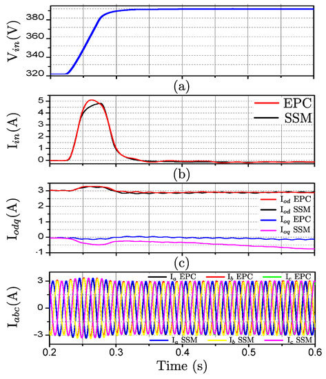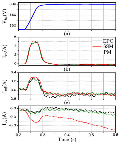 In Figure 12 the polytopic model is compared with the response of the EPC with a step of 60 V in the input voltage. Equivalently, the comparison is shown when the reference of the d component of the output current is increased in 9 A in Figure 13 and when the reference of the q component of the output current is increased in 10 A in Figure 14.
