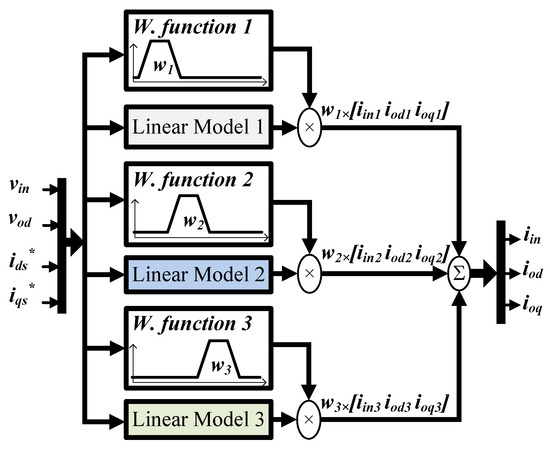 To improve the model accuracy when the operating point is varied in a wide range of values, the polytopic approach is applied. As mentioned in Section 2, this methodology is based on a weighted combination of small-signal models identified around different operating points. This approach has been successfully applied in DC systems [17,19,20,31], and extended to AC EPCs in [35] at simulation level. Therefore, the present work is the first evidence of a polytopic model applied to represent an actual three-phase DC-AC EPC.