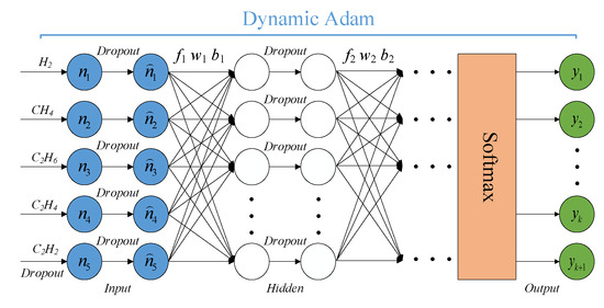 The rest of the paper is organized as follows: Section 2 presents the theoretical basis and framework of the deep neural network based on Dynamic Adam and dropout (DADDNN). The process of constructing the DADDNN for transformer fault diagnosis and the related experimental results are given in Section 3. Validation of model generalization performance is demonstrated in Section 4, where discussions along with performance comparison with IEC, Duval Triangle, SAE, DBN, and GSSVM methods are given. Conclusions are drawn in Section 5.
