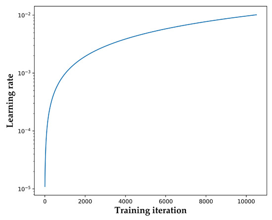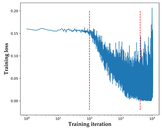 By observing Figure 4, we preliminarily determined that the training loss fell rapidly during the training epochs [0, 200]. It can be clearly seen in Figure 5 that the training loss started to descend sharply from the 100th iteration. Through conversion, taking the 100th iteration and the 4140th iteration as nodes, we could precisely calculate the optimal interval of the learning rate, as shown in Figure 6.