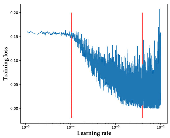When the learning rate enters the optimal range, the training loss (network loss in training) will drop steeply and maintain a downward trend. We gradually increased the learning rate at every iteration and observed the rise and fall of the training loss to determine the optimal interval.
