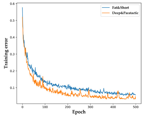 As shown in Figure 7, the convergence speeds were quite similar at the beginning. However, the performance difference was exhibited just after 16 learning epochs and the training error of the fat and short structure was higher than 5% at the end. The models with deep and paratactic structure had better performance as the training error was further reduced to 3%.