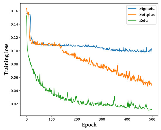 We adopted the Relu function to activate the DADDNN with the characteristic. The output was set to zero when the input value was less than zero; otherwise, the output was equal to the input. Meanwhile, Sigmoid and Softplus functions were also used for training. The convergence results are shown in Figure 8.