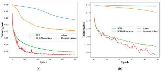 As for optimization algorithm, we utilized the proposed Dynamic Adam whose exponential decay rates and for the moment estimates were set to 0.9 and 0.999. The was initialized to 4.006×. To improve the stability, and the constant for numerical stability were set to and , respectively [41]. At the same time, SGD, SGD+Momentum and Adam optimization algorithms were also applied to Dataset 2 for comparison.
