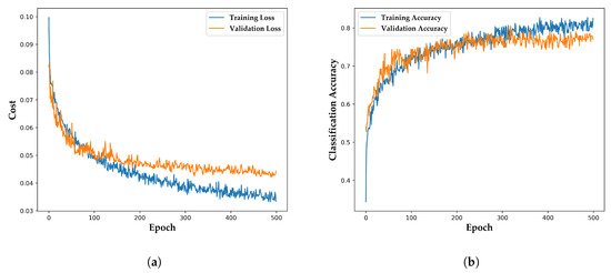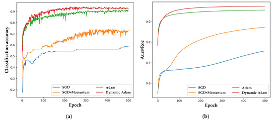 The classification accuracies for the four optimization algorithms are shown in Figure 10a. During the last 100 epochs, the upward trend converged to the stable point obviously. Precisely, the average accuracies were: 55.0% for SGD, 70.8% for SGD+Momentum, 86.8% for Adam, and 93.1% for Dynamic Adam. The area under the receiver operating characteristic curve (Auc@Roc) of Dynamic Adam achieved 97.5%, indicating its progressiveness.