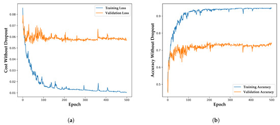 As shown in Figure 11, the difference between training curve and validation cure of DADDNN without dropout was large. Average values gap of training accuracy and validation accuracy was 20.0%, indicating that the model is over-fitted. Conversely, the convergence process of DADDNN with dropout was normal (Figure 12), demonstrating that the dropout technique is suitable for preventing over-fitted.