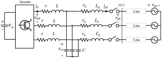 The system under consideration consists of a three-phase inverter connected to the grid through an filter and a line, as depicted in Figure 1. The capacitors of the filter are denoted as while the inductors are denoted as L and with their parasitic resistances being r and , respectively. The line-to-line inverter voltage between phases a and b is given as , while represents the phase voltage of the inverter. The capacitor voltage is denoted as while the PCC voltage is with where V is the RMS PCC voltage and is the angular PCC frequency. The grid voltage is denoted as and is considered as unknown in this paper. The inverter and grid side currents are and respectively. When considering a balanced system, the above voltage and current quantities match with the positive sequence components. However, in the presence of unbalanced grid conditions, both positive and negative sequence components appear, while zero sequence components can be neglected when considering a three-phase three-wire system. In order to obtain the dynamic model of the system in both sequences, the widely used synchronous reference framework (SRF) theory is considered together with the delay signal cancellation (DSC) sequence extraction method [25,26], as explained in the analysis that follows.