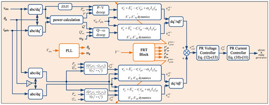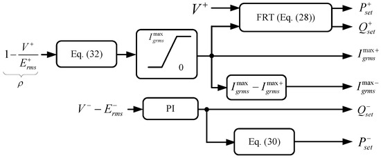 When current allocation has taken place, the value can be easily selected as and the positive sequence reference powers can be calculated according to the FRT guidelines in Equation (28), while when from Equation (32) or due to the saturator, then and Since the maximum current for each sequence is now defined according to the voltage drop, the proposed controller dynamics in (16), (17), (23) and (24) can be adapted online through the expressions Opposed to the work presented in [15,38], here the proposed design enables the adaptation of the controller parameters and and the controller states are attracted on any ellipse E with varying horizontal radius ( or ) as analytically proven in Section 3.2. The positive sequence maximum current is set as the amplitude and not the RMS value in order to allow for the FRT. However, since it holds that the maximum RMS current will never be violated at the steady-state, while during transients, through the input-to-state stability property of the closed-loop current dynamics, it is proven that it remains below the value (worst-case scenario), which commercial inverters can handle [39]. Finally, during normal grid conditions, can be simply selected as to ensure current limitation under the value at all times. The implementation of the proposed control approach is depicted in Figure 2, where the control part generating the positive and negative sequence reference powers and the maximum currents is denoted as the FRT block, which is shown in Figure 3.