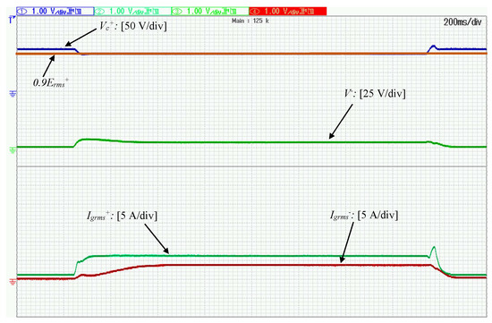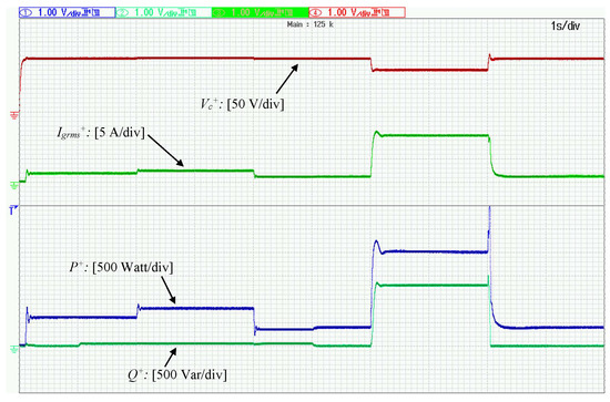 Firstly, the operation of the grid-connected inverter equipped with the proposed controller will be tested under balanced grid conditions. The switch between the filter and the PCC is initially open, and then closes at , while at the same time the controller is enabled with the reference values and having the values of and respectively. The controller operates initially in the PQ-set mode and regulates and to their desired values, as shown in Figure 4. In the same figure, and can be observed as well. At is changed to and the reactive power injection is accordingly modified while at is set as Since the PQ-set operation is now verified, at and the real and reactive power droop control modes are enabled respectively. One can see that both the real and the reactive power drop since at that time, the grid operates with a slightly higher value of RMS grid voltage compared to the nominal () and a slightly lower than the nominal grid frequency (). At a balanced grid voltage drop of is applied in order to test the operation under faulty grid conditions. At the initial transient, it can be observed in Figure 4, that reaches the value of while it never violates the ultimate bound of