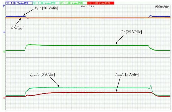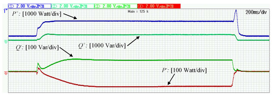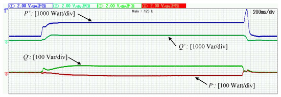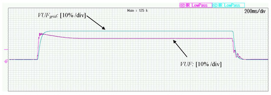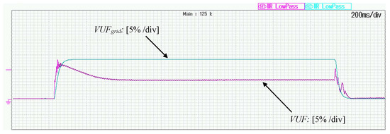 In order to test the operation of the proposed controller under unbalanced faults, a single-phase voltage sag is applied on with its RMS value dropping by which leads to while the inverter is operating with droop control. As it can be observed in Figure 5, the current allocation algorithm leads the RMS currents to the values and . It should be noted that according to the proposed controller operation, the components and are tracking their maximum values from Equations (32) and (33) during voltage drops (unless the desired regulation has been achieved with less than the maximum negative sequence current). Hence, the total current is regulated close to its maximum value but without exceeding it. The primary objective of the proposed controller is achieved since as it is depicted in Figure 5, is regulated to This verifies the proper selection of the value which further leads to the calculation, while the rest of the available inverter capacity is assigned to negative sequence current controller so that shown in Figure 5, is eliminated as much as possible. The real and reactive power components injected to the grid according to Equation (28) and Equations (29) and (30) are depicted in Figure 6 while, even if the proposed controller does not deal directly with the VUF but aims to increase the positive sequence voltage and eliminate the negative sequence voltage, in this certain scenario, it can be seen in Figure 7 that at the PCC is eliminated by 7% when compared to At the steady-state, and are not tracked since priority is given to the current-limiting property. However, if greater capacity was available, such that and would be regulated to their reference values. After the fault is self-cleared and the positive sequence components are driven to their initial values according to droop control while the negative sequence components are driven to 0.