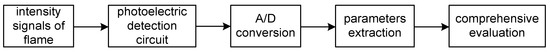 An experimental and measuring system for detecting flame combustion stability is constructed. It includes an optical sensing device, a transmission device, and a computer. The radiation signal is transmitted to the phototransistors of the probes The optical signal is converted to a voltage signal. The flame signal is obtained via A/D (Analog to Digital Converter) conversion. The data is transferred to the processing computer, and then the characteristic parameters from the time, frequency, and phase domain are extracted, respectively. The model of fuzzy comprehensive evaluation is established, and the index system is also established. As a comprehensive statistical analysis method, the fuzzy comprehensive evaluation method can be effectively used to reveal the flame combustion stability. The results of the fuzzy comprehensive evaluation are presented in the form of vectors, and the evaluation information provided is more abundant than other methods [17]. The fuzzy comprehensive evaluation method has strong applicability and can be used for comprehensive evaluation of subjective factors and objective factors [18]. Figure 1 shows the flowchart of flame detection.
