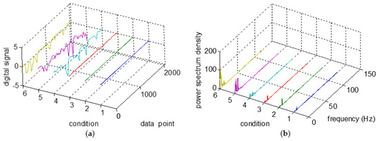 During the combustion of fuel, a large amount of energy is radiated. On account of the altering of the flame shape, the thermal radiation, and the conversion between vibrational energy and rotational energy, the radiation intensity and the flicker frequency will be systolic. The stable flame means that the flame maintains a continuous envelope. For the unstable flame, the flame at the bottom of the burner fluctuates greatly, and the flame in the downstream flutters quickly. Six groups of time–frequency plots of radiant intensity signals in different working conditions are showed in Figure 3, among which the first threes are steady states, and the last three are unsteady ones. As is shown in Figure 3, there are large difference in time domain and frequency domain between steady states and unsteady states.