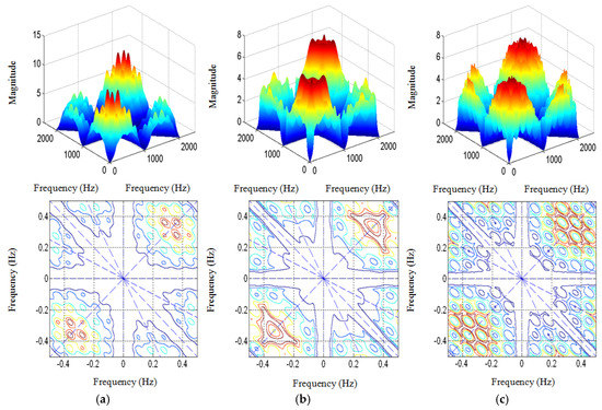 Bi-spectrum of high-intensity unsteady state: (a) gas provision = 400 L/h, one-step air provision = 800 L/h; (b) gas provision = 400 L/h, one-step air provision = 0 L/h; (c) gas provision = 600 L/h, one-step air provision = 800 L/h.
