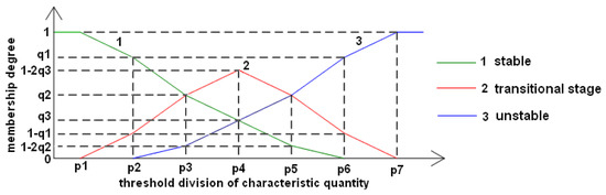 The most important feature of the fuzzy set theory was fixing the membership as continuous closed interval (0, 1) rather than {0, 1}. The membership degrees were applied to solve the contradiction that many other laws are always ignored by the exact demarcation due to the complicated factors. The membership degrees of the judging index were calculated by the membership functions. Based on the analysis of the relationship between the flame instability and the characteristic parameters, the membership degrees of the ith evaluation grade are shown in Figure 9. Number 1 presents the stable condition, while number 0 presents the unstable condition. The line ‘stable’ describes the level of approaching the stable condition and the line ‘unstable’ exhibits the probability of being the unstable condition. The threshold (p1–p7) of characteristic quantity was set by practical experimental experience. When the numerical value of the characteristic parameters was less-than p1, the state of the flame combustion was considered highly steady and the membership degrees were (1, 0, 0). The possibility of being highly unsteady was not clear until the value reached p2. Two critical points came forth with increases in the value. They illustrated the coequal probability of approaching two closer states. As a transitional state, the line ‘transitional stage’ reached the top in the middle of the threshold. Similarly, the state of the flame combustion was considered highly unsteady and the membership degrees were (0, 0, 1) when the numerical value of the characteristic parameters was more-than p7. By analyzing the measurement database of this experiment, the formula (5.1) – (5.3) manifested the membership degrees of the judging parameters and the thresholds of membership degrees and characteristic parameters, as seen in Table 1 and Table 2.