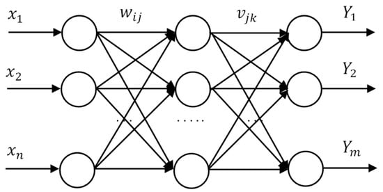 Now, we consider a three-layer neural network consisting of one layer for each input, hidden layers, and output layers. The three-layer back propagation (BP) neural network is illustrated in Figure 2. The output of the output layer is expressed as follows [14,16,18,30]: