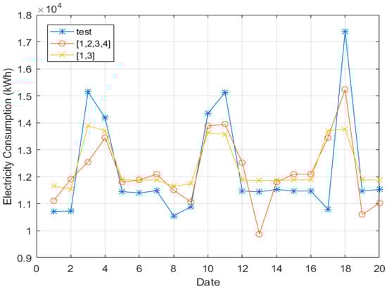 From the simulation results, we investigate how “Humidity” and two inputs {Temperature, Working Day} affect building electricity consumption. As illustrated in Figure 3, input {1, 2} with humidity results does not guarantee agreement with the test value. This means that “Humidity” is not a predictor of energy consumption. From Figure 3, the results are consistent due to low standard deviation, but the prediction results do not follow actual test data.