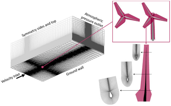 24], with a height of 100 m. The nacelle is 12 m long and its section measures 5 m × 5 m. The mesh on each blade wall is designed to ensure a
