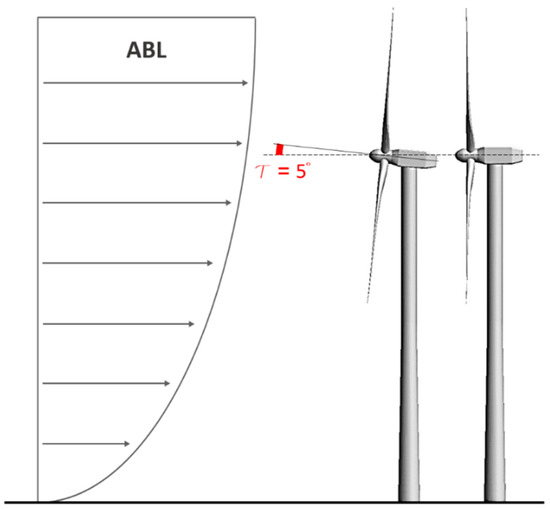 Figure 3, and as normally done in order to guarantee more blade-tower clearance during the operation of the machine. Lastly, a 5° yaw misalignment is introduced by rotating the whole machine around an axis parallel to its tower, mimicking an incorrect orientation of the turbine. Both the tilt angle and the yaw misalignment are imposed by rotating the rotor around the appropriate axes crossing the center of the rotor, in order to guarantee the same position of this point (and thus exposing the rotor to the same ABL velocity gradient) in every simulation.