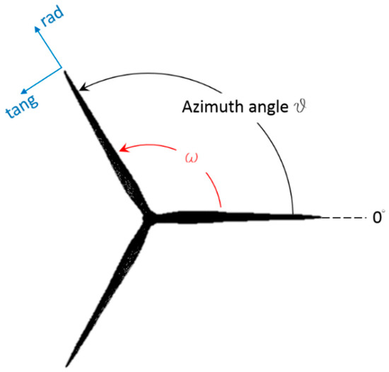 Figure 4 is used to define the azimuthal position of each blade. A cylindrical coordinate system will be used to define the radial, tangential, and axial (i.e., aligned with the axis of rotation of the machine) directions, according to