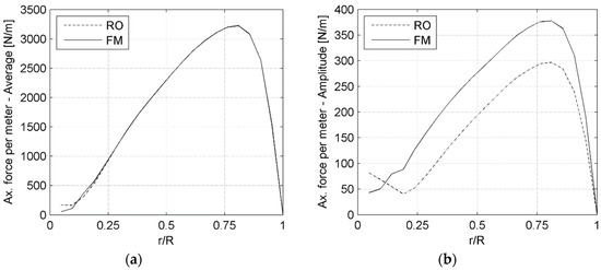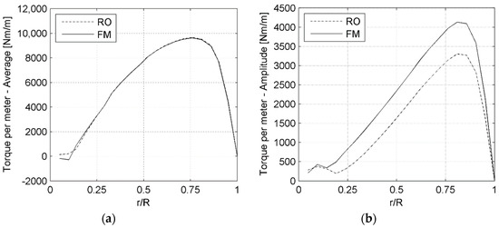 Figure 7 shows the average value (a) and the peak-to-peak amplitude of the oscillation (b) of the torque per meter of blade as a function of the span of the blade, obtained over the full revolution.