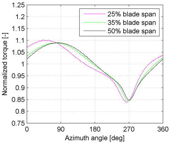 Figure 11 shows the torque provided by different low span sections of the blade, normalized by the respective average value, for the FM + T simulation.