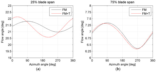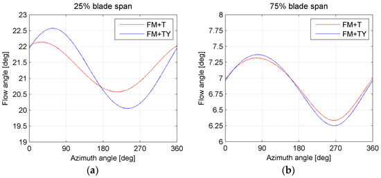 It can be observed that, moving up along the span of the blade, the phase shift gradually disappears and, at 50% of the span, it is no longer observed. This shift can be related to the change in the local angle of attack induced by the tilt angle. Because of this angle, tangential and radial components originate from the wind velocity. The velocity triangles are consequently changed; this translates directly into a different distribution of the angle of attack, which is much more important in the inboard part of the blade, where the blade speed and the wind speed are comparable in magnitude. On the contrary, in the outboard section of the blade, the changes in the wind speed are small compared to the much higher blade speed. The flow angle can be computed as a function of the azimuthal position of the blade at the two examined spanwise locations (
