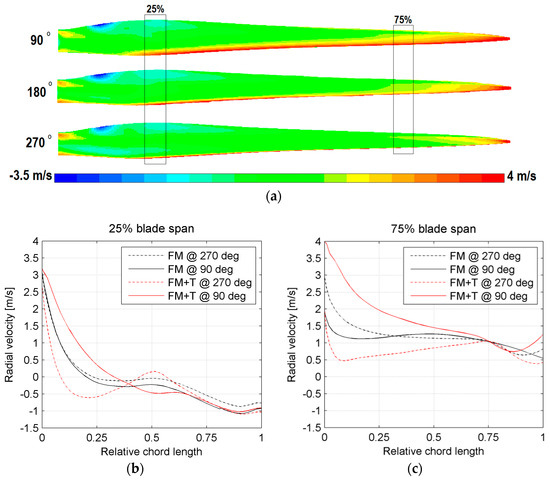 Figure 13c) in the first cell attached to the blade wall at 75% of the span, averaged over the entire chord length on the pressure side, is 1.23 m/s for the untilted configuration and 0.77 m/s for the tilted configuration. The difference between these numbers (0.46 m/s) is comparable to the analytically computed difference at 270° and equal to 0.54 m/s (