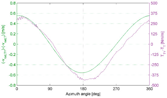 When the blade points upwards (azimuth angle between 0° and 180°), it is exposed to a higher wind speed and thus the angle of attack over the entire blade is increased, leading to higher torque. The same reasoning reverses when the blade points downwards, i.e., for azimuth angle between 180° and 360°. Qualitatively similar results were obtained in the literature [
