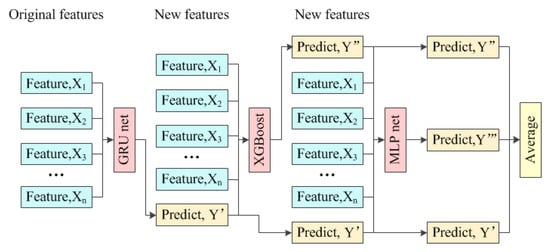Firstly, a gated recurrent unit network (GRU) is trained with all original features, and the performance of the trained GRU network is tested based on a training set and a testing set. The original features and the predicted output power will form new features for the next model. Secondly, an XGBoost is trained with new features, and the performance of the trained XGBoost is also tested based on a training set and a testing set. The original features, the predicted output powers from the GRU network, and XGBoost again form new features for the next model. Thirdly, a multi-layer perceptron network (MLP) is trained with new features, and the performance of the trained MLP network is examined using the test set. Finally, the predicted output powers from the GRU network, XGBoost, and MLP network on the test set are averaged to get the final results.