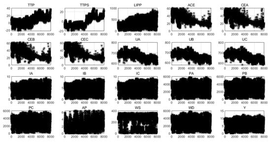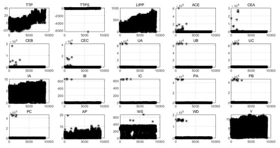 We visualized 20 variables through Figure 3 and found that there were some outliers in each variable. The outliers of each variable were selected using the quartile method and were replaced with the normal value of the previous timepoint. After data cleaning, the scatter plot of the 20 variables is shown in Figure 7.