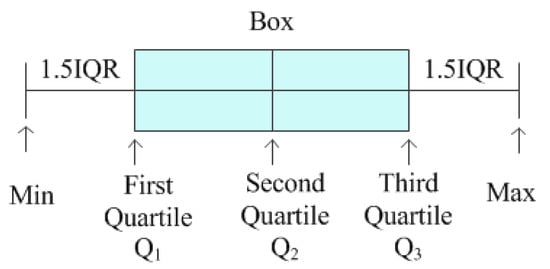 The quartile method is an important method used to analyze data distribution in statistics []. It is often used to identify outliers. The principle of the method is shown in Figure 4.