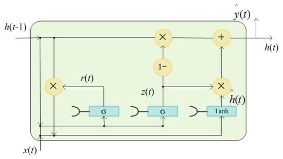 The GRU network unit structure is shown in Figure 5. The GRU unit is mainly composed of an update gate and a reset gate. The update gate is used to control whether the status information of the previous moment is brought into the current state. The larger the value of the update gate, the more status information of the previous moment is brought in. The reset gate is used to control whether the status information of the previous moment is lost. The smaller the value of the reset gate, the more information is lost. The relationship between the input and output of GRU units can be expressed as follows: