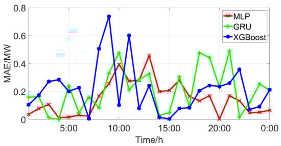 After data cleaning by the proposed method, the prediction accuracy of LSTM, MLP, and XGBoost was greatly improved, which shows the superiority of the proposed methods. As far as any single model is concerned, the prediction accuracy of MLP was higher than those of LSTM and XGBoost. Further, Figure 8 shows the MAPE of different models on a randomly selected day. Although MLP has the smallest average error, it has the greatest error at certain times, such as at 1:00 p.m.