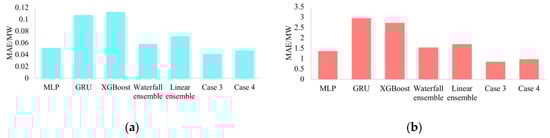 Furthermore, we calculated the error of the test set by different methods, and the statistical results are shown in Figure 9. The Waterfall ensemble refers to the sequential concatenation of MLP, GRU, and XGBoost []. The predicted results of MLP were used as the input for GRU. Similarly, the output of GRU served as the input to XGBoost. Finally, XGBoost output the predicted results. The Linear ensemble refers to training MLP, GRU, and XGBoost, respectively, and calculating the mean of the test set. The framework of the ensemble can be seen in reference []. Obviously, the Waterfall ensemble and Linear ensemble prediction errors are smaller than those of GRU and XGBoost but larger than that of MLP, which indicates that the traditional ensemble techniques need to be improved. Compared with the prediction errors of Case 3, Case 4, and other methods, we can conclude that the proposed method can not only reduce the average prediction error but also reduce the maximum prediction error.