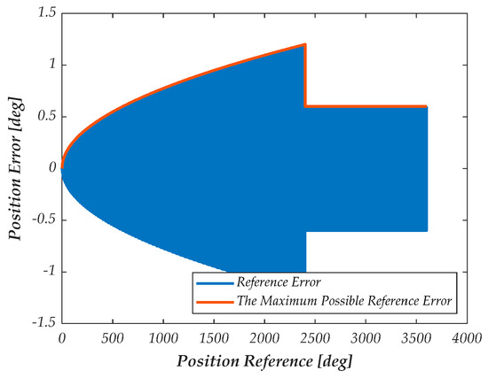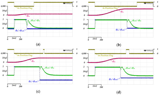 The reason why the actual position of 1200 [deg] reference does not reach to the position reference is shown in Figure 9. The errors exceeding 2 [deg] are represented as 2 [deg] in Figure 9. The position errors, θmtb* − θm, between the position reference generated by the time-based generator and the actual position converge to 0 regardless of the input position reference. As a result, the position controller can trace the generated reference. But, the reference errors, θm* − θmtb*, between the input position reference and the generated position reference are different depending on the input reference. As show in Figure 9a, when the input reference is 1200 [deg], the reference error is 0.3589 [deg] which is larger than the allowable position error. On the contrary, the reference error of 3600 [deg] reference is 0.06393 [deg], which is acceptable. It means that the steady-state error is caused by the time-based profile generator. Depending on the input position reference, the reference error can exceed the allowable position error. Under experimental conditions, the largest reference error of the triangular and trapezoidal profiles occur when the position references are 2398.9 [deg] and 2400.7 [deg], respectively. From the mathematical analysis, the largest reference errors are 1.2 [deg] and 0.6 [deg] for these references. And, the actual reference errors are 1.108 [deg] and 0.5082 [deg] as shown in Figure 9c,d, which is similar to the analytical value. Hence, even if the position controller works well, the reference error can be caused by the time-based profile generator as mentioned in Section 2.