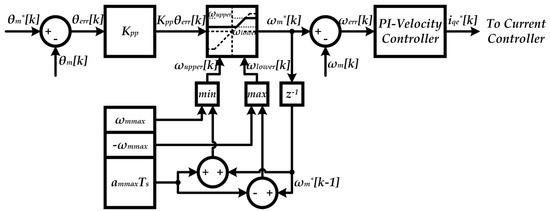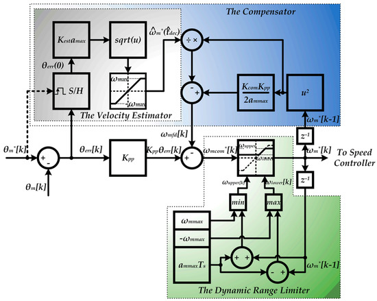The block diagram of the cascaded P-PI controller on the discretized time base with the dynamic range limiter for the acceleration and velocity limitation.
