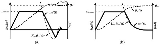 The trapezoidal velocity profile has a constant acceleration, velocity and deceleration. As shown in Figure 1a, in the constant acceleration region, the acceleration is the maximum positive value, ammax, until the velocity reaches the maximum value, ωmmax. After the constant velocity region where the acceleration and velocity are zero and the maximum value respectively, the velocity decreases to zero with the maximum deceleration, −ammax. However, the profile sometimes has to be a triangular velocity profile depending on the magnitude of the position reference. If the magnitude of the position reference is not large enough, the constant velocity region is not only unnecessary but also the acceleration and deceleration regions are shortened. Hence, the profile consisting of only the constant acceleration and deceleration regions has a triangular shape as shown in Figure 1b.