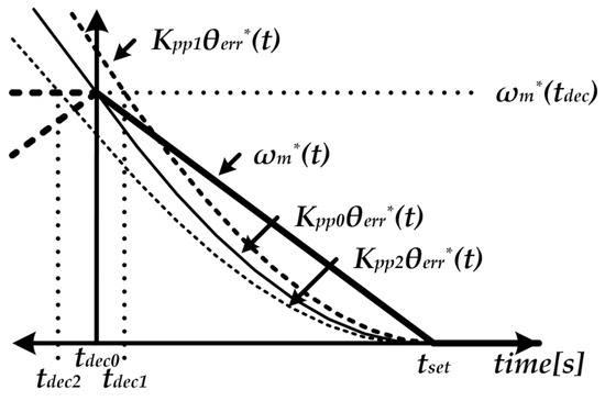 At the deceleration start time, the position controller output is same as the velocity reference. Hence, the proportional gain of the position controller for the desired profile, Kpp0, is derived as (16). The maximum acceleration value is determined considering the system requirements. The velocity reference at the deceleration start time is determined by the position reference. In result, the controllable parameter is only the proportional gain of the position controller, Kpp. However, because the proportional gain affects the position response characteristics, it is also hard to determine the proportional gain with the value of (16).