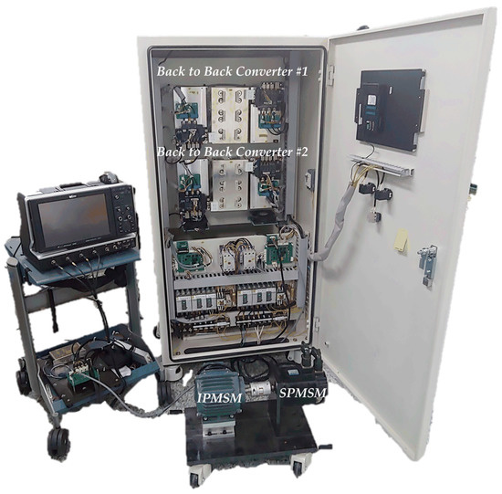 Some experiments for verifying the effectiveness of the proposed profile generator are performed with the experimental setup as shown in Figure 7. Only the second back to back converter and Surface mounted Permanent Magnet Synchronous Motor (SPMSM) are used. The specifications of SPMSM are listed in Table 1. The overall control algorithms are implemented using TMS320C28346 microcontroller manufactured by Texas Instruments (Texas Instruments, Dallas, TA, USA). The switching frequency and the current control frequency including the conventional time-based profile generator are 10 [kHz]. And, the control frequency for the cascaded P-PI position controller is 1 [kHz]. The maximum velocity and acceleration are 2000 [rpm] and 10,000 [rpm/s], respectively, which are same as the conditions of Figure 2.